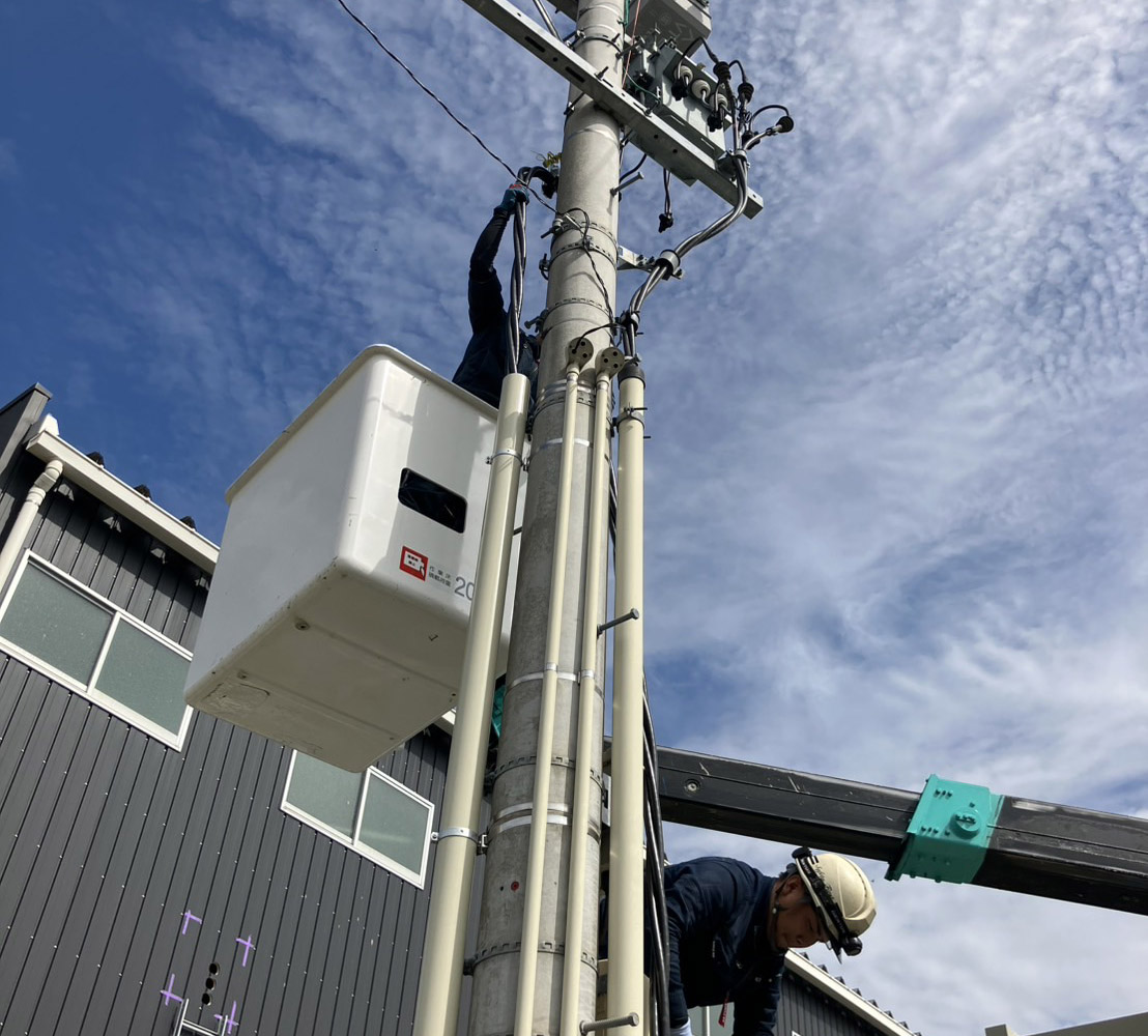 高圧電気を扱う工事です。消費電力が高い設備でも電力切れを起こさないよう補助電源の工事にも対応しております。